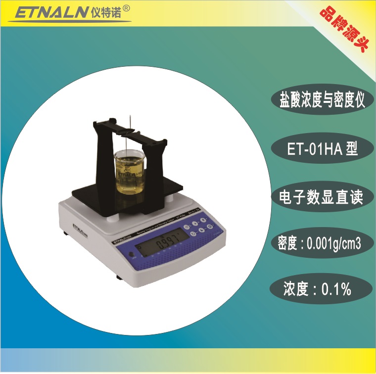 鹽酸濃度與密度測試儀ET-01HA是根據(jù)阿基米德原理密度法,自動顯示鹽酸濃度值HCL%、波美度Be、密度SG;具有測量精準、操作快速簡便、可靠性高等主要特點; 同時可轉(zhuǎn)換標(biāo)準溫度20℃狀態(tài)下鹽酸濃度值。
