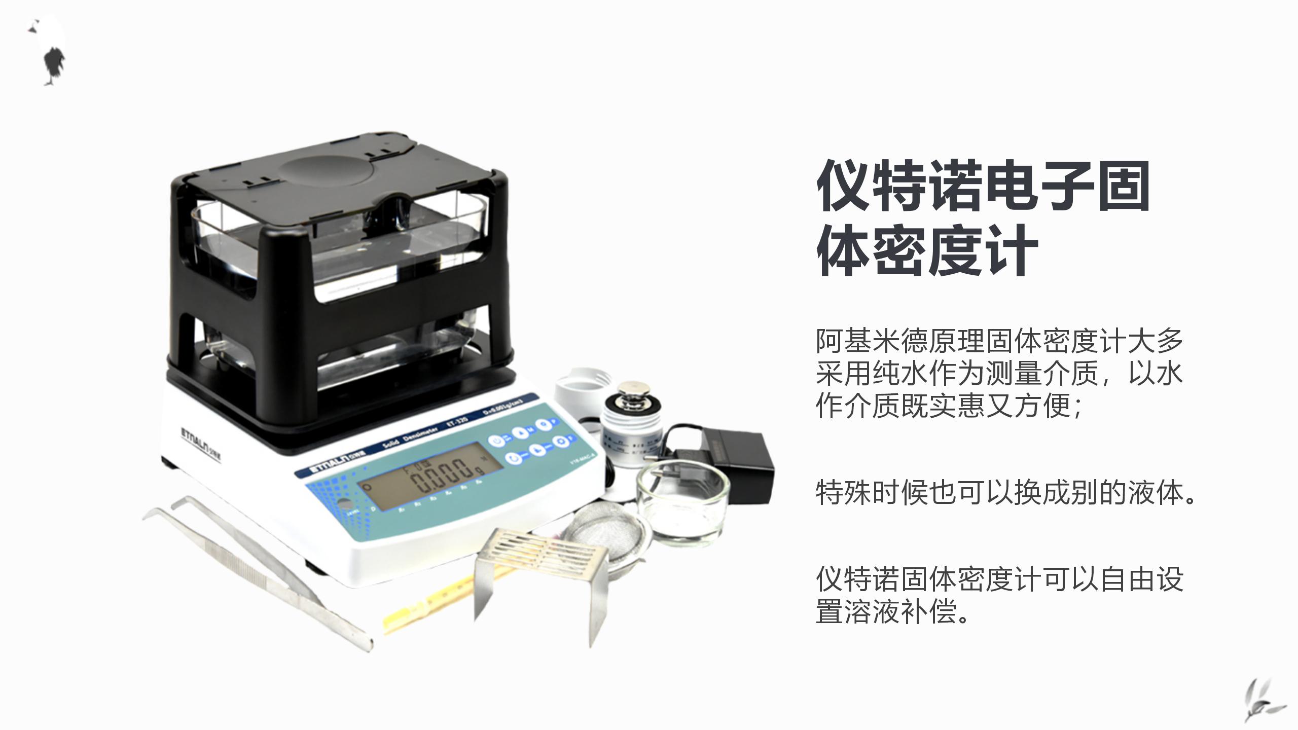 阿基米德原理固體密度計大多采用純水作為測量介質(zhì),以水作介質(zhì)既實惠又方便;特殊時候也可以換成別的液體。儀特諾固體密度計可以自由設(shè)置溶液補(bǔ)償。